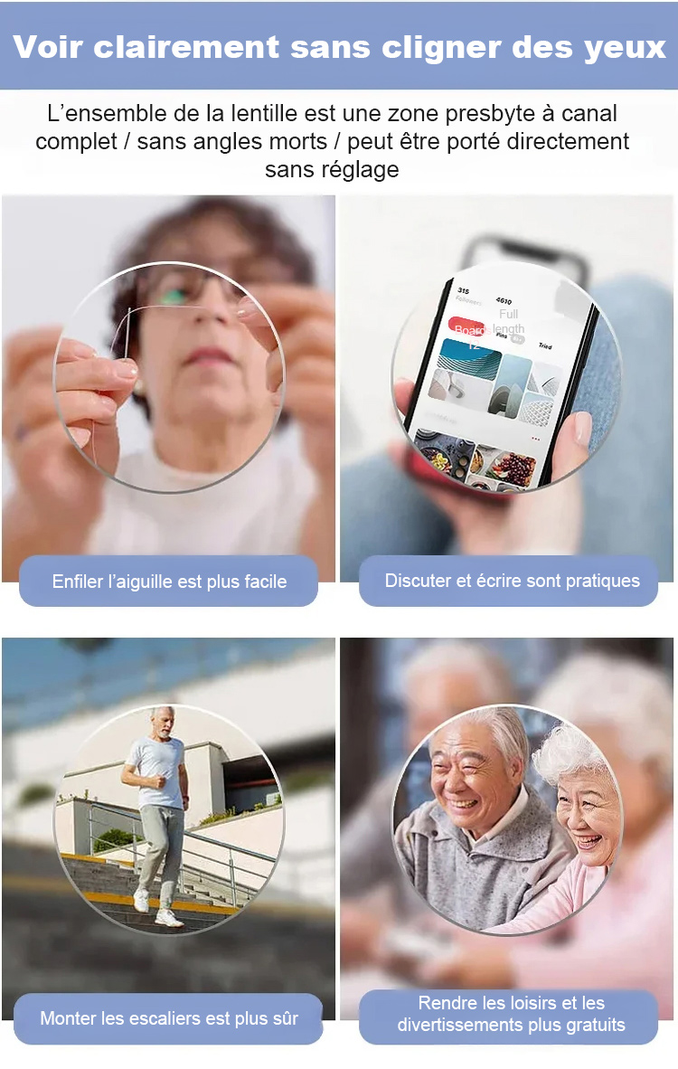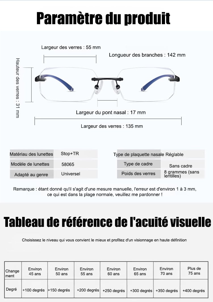 Recommandé par l'Association parisienne de médecine ophtalmologique, ajustement intelligent des dioptries de 100 à 700°, pas besoin de changer même si la prescription change.